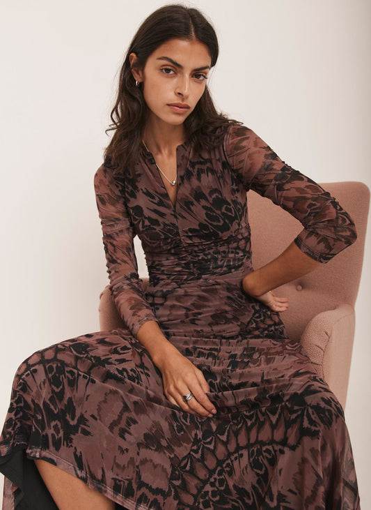 Black Feather Print Mesh Midi Dress