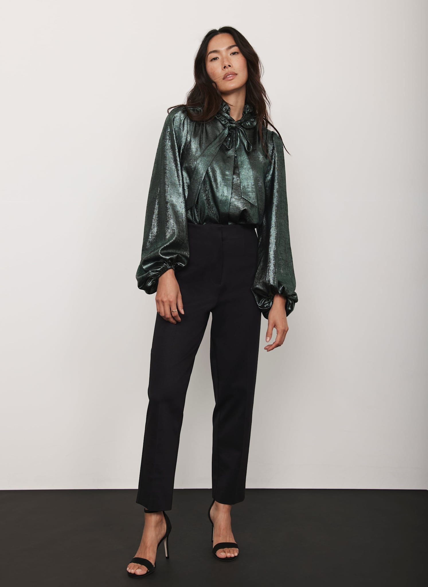 Green Metallic Pussy Bow Blouse