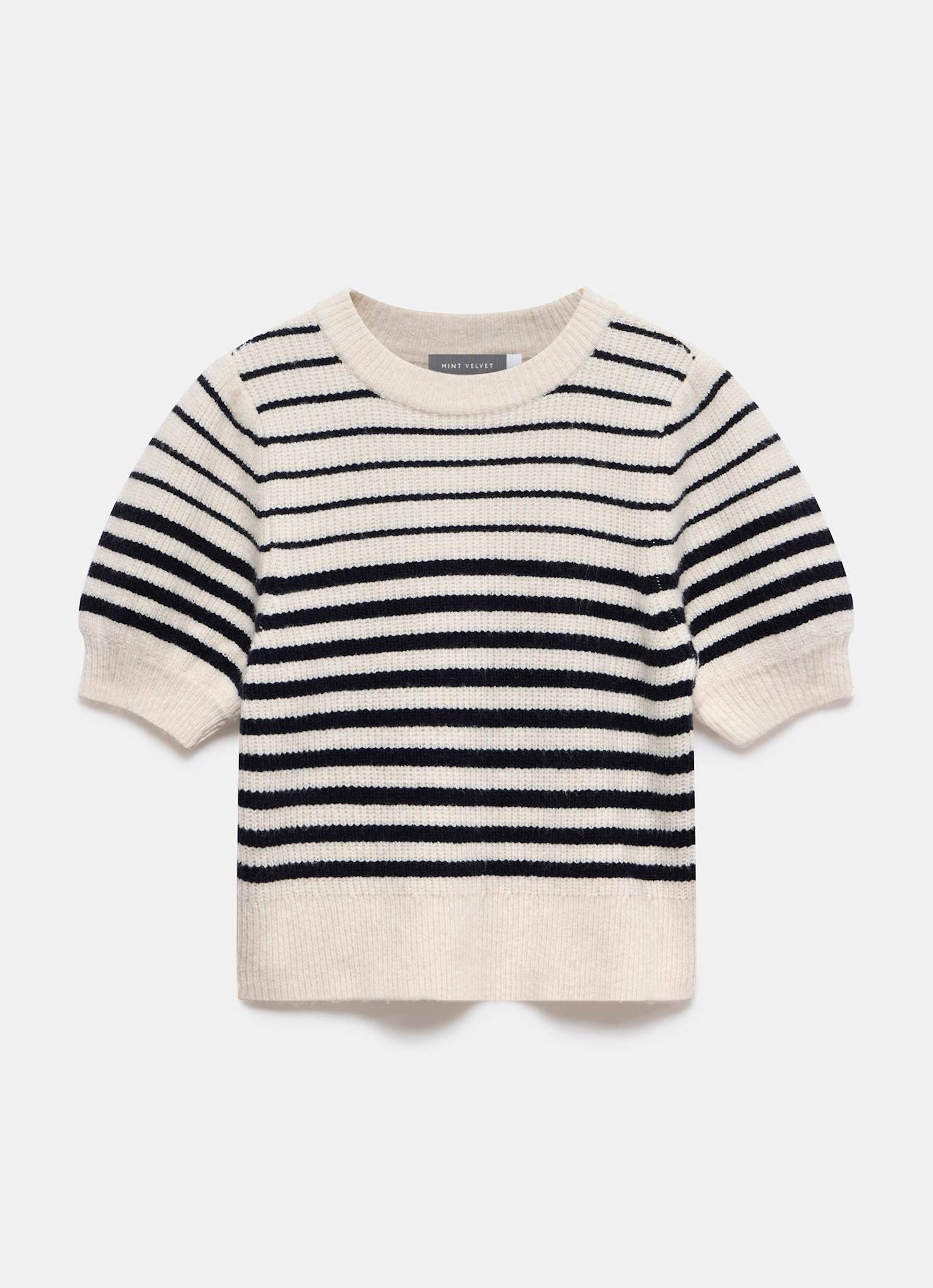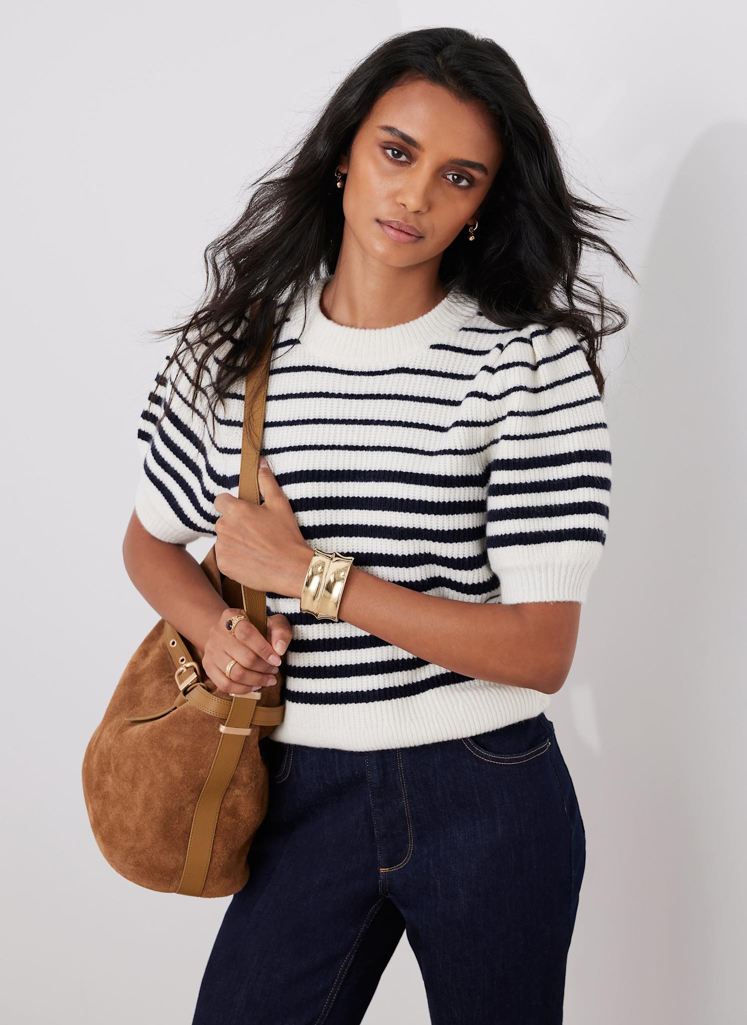 Navy Striped Puff Sleeve Knit Top