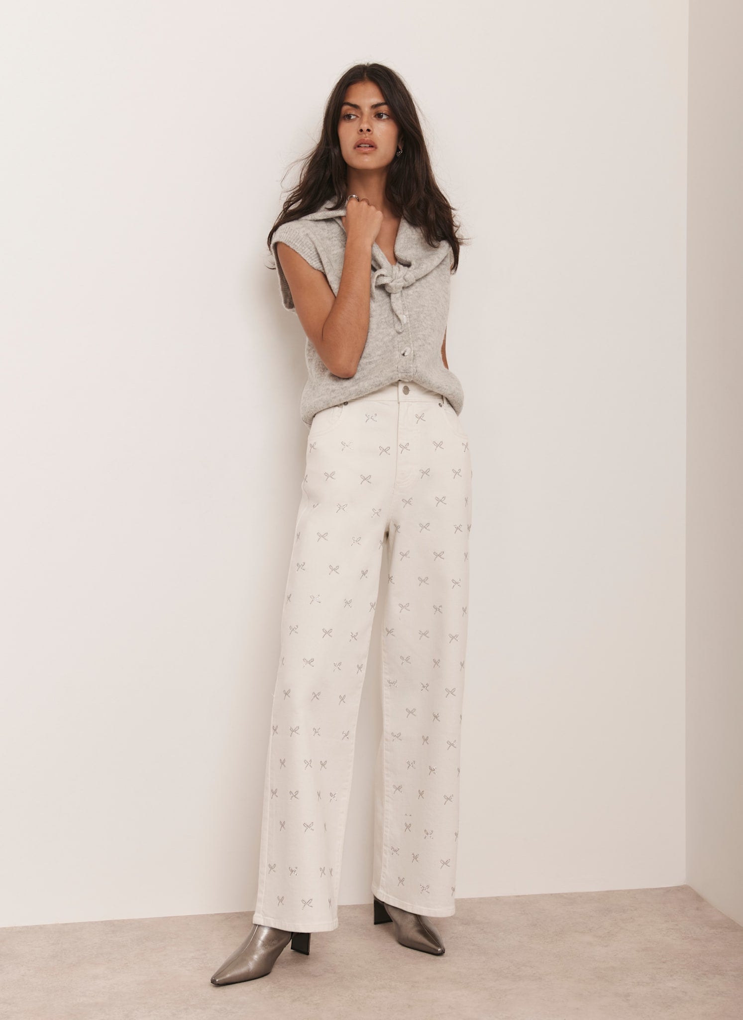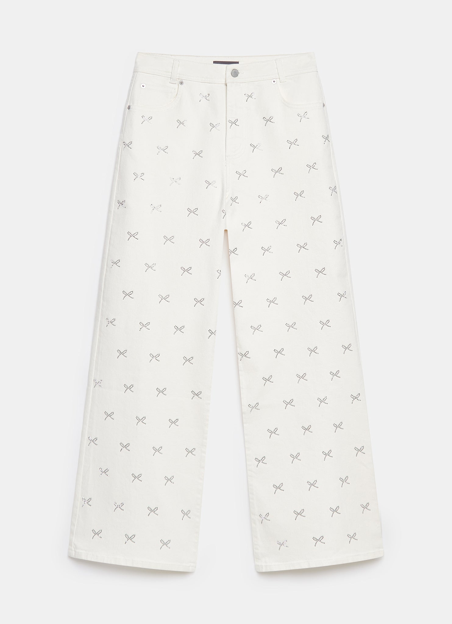 White Bow Embellished Wide Jeans